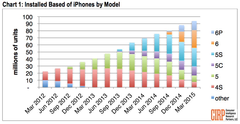 In a report issued Friday, Consumer Intelligence Research Partners estimated that Apple’s installed base of 94 million iPhones includes 25 million iPhone 6 models and 13 million iPhone 6 Plus.