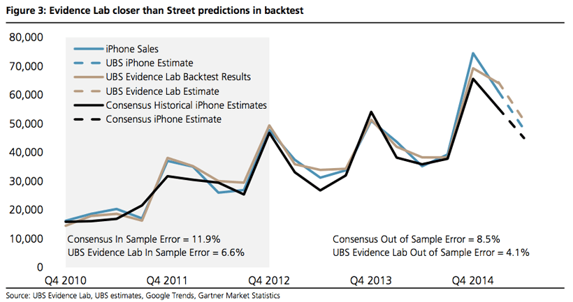 “Based on just two quarters of data,” he writes, “it has correctly pointed to higher iPhone units compared with the Street consensus. In Dec it was low at 69mn units vs. the 74.5mn Apple shipped but was closer than the Street. Last quarter it was high at 64.4mn vs. the actual 61.1mn but especially early in the quarter was closer than the Street.”