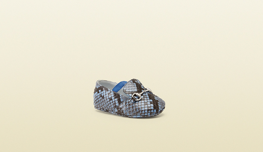 These Gucci baby loafers come in three colors, and they have elastic to help hold them on. Those characteristics are to be expected. The next part of their description is less common, but not unheard of for a designer shoe: they have palladium horsebit details, and they're made in Italy. Final descriptors, least common: these baby shoes are made out of python skin, they cost $495, and they are for babies -- who are not walking yet.
