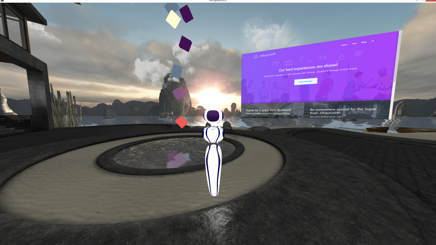 The AltspaceVR social platform, which just launched, allows people to create an avatar and enter common VR spaces for social events, or create their own private VR spaces. Over 200 people gathered to watch the Super Bowl this year in VR at an open beta event the company hosted.