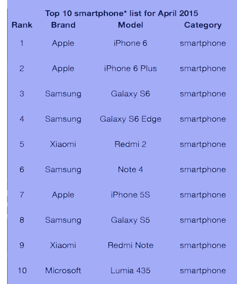 Apple’s iPhone 6 and 6 Plus in April remained the world’s No. 1 and No. 2 best-selling smartphones, shipping in volumes 51% higher than the iPhone 5S and 5C, according to Counterpoint.