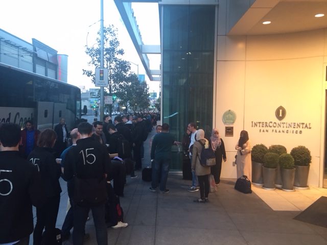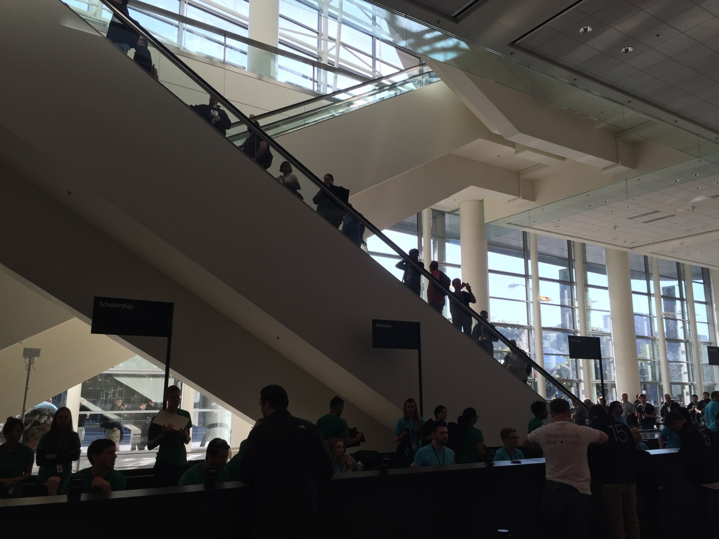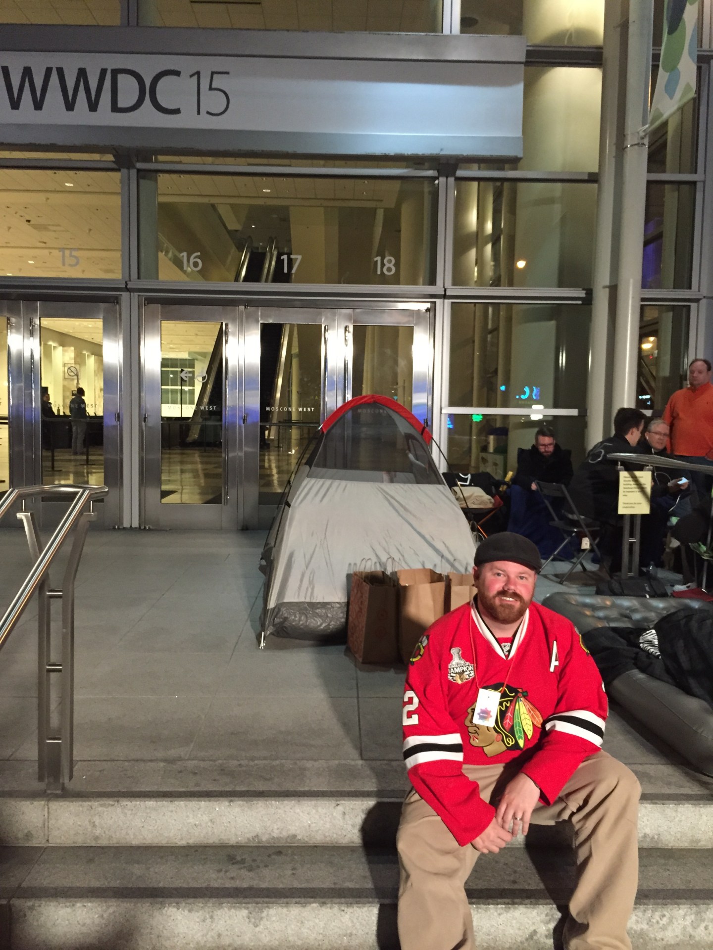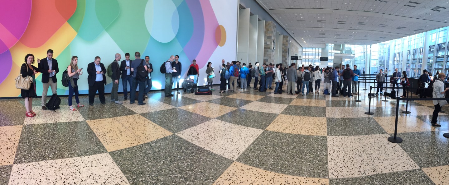 4:35 a.m. Heading for Moscone in the dark, ran into a surprising number of guys in WWDC 15 sweatshirts walking the wrong way. Coffee junkies, looking for a caffeine fix. The line in front of the 4th St. Starbucks was 40 nerds long.