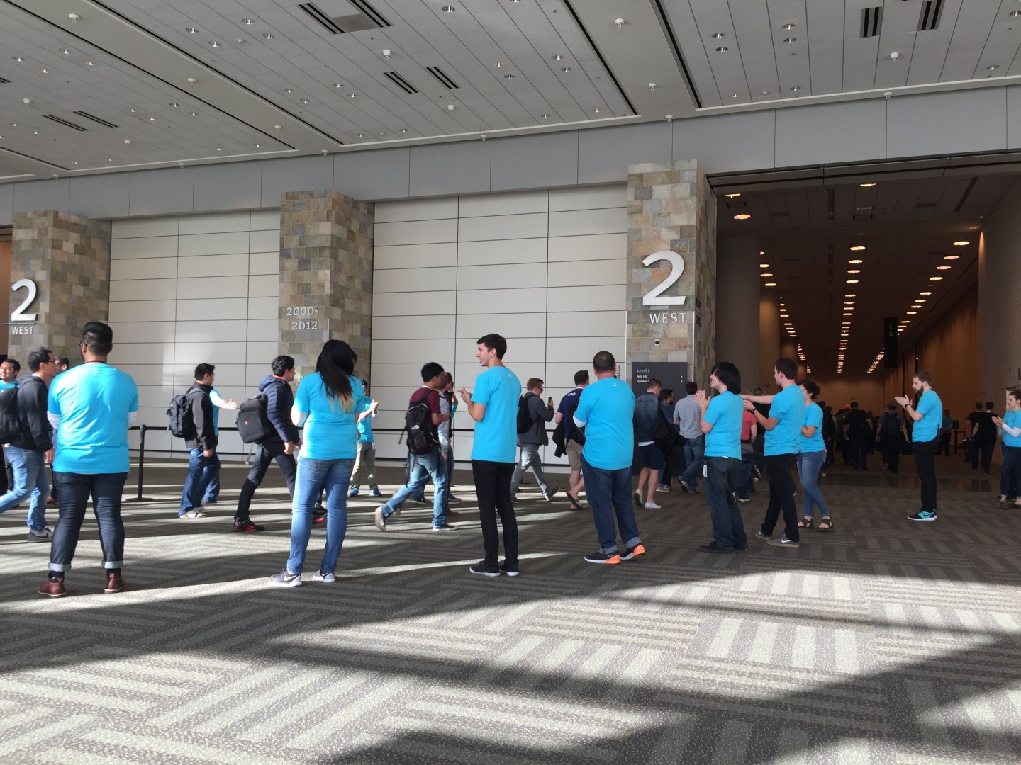 9:15 a.m. Doors open. The press and VIPs stream in at a fast walk. The developers at a full-out run. Reminder: You can follow the keynote live on Apple TV or at Apple’s event page here.