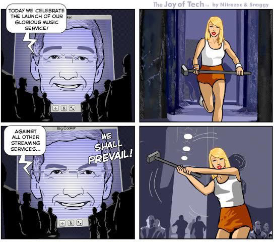 Nitrozac and Snaggy have been around the block enough to see the irony of Apple recapitulating Ridley Scott’s 1984 Macintosh commercial with Tim Cook as Big Brother and Ms. Swift as the only one brave enough to think different.