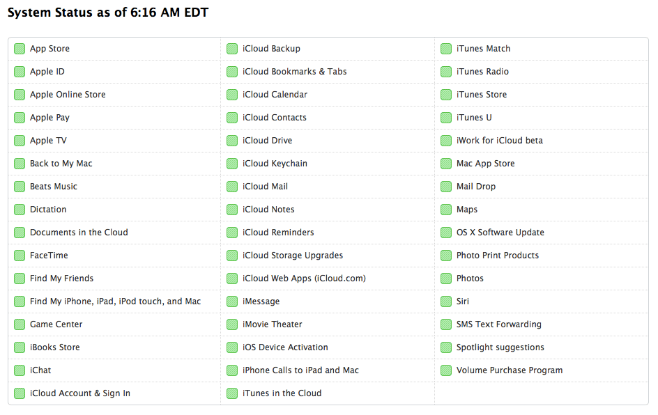 As of this morning, Apple’s system status page showed 47 different cloud services, from App Store to Volume Purchase Program with things like Siri, Apple TV and Find My Friends in between.