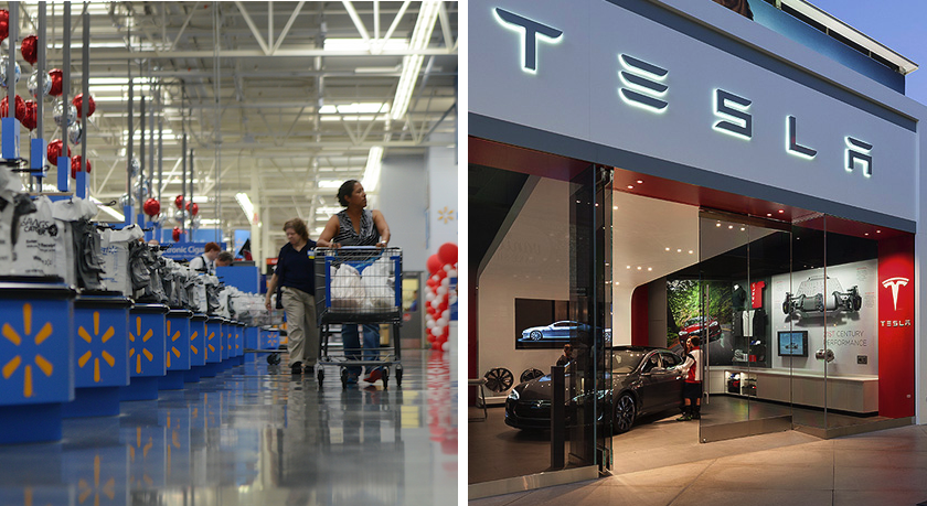 Walmart and Tesla have more in common than you might think. Strong founders with stories designed to capture the imagination of consumers have fueled both brands—around low prices in the case of Walmart, and around the future of electric autos at Tesla. While Tesla is looking for cash—and presumably profits, according to a Wall Street Journal report on Sunday, Walmart is looking to increase profits after a miss last quarter.