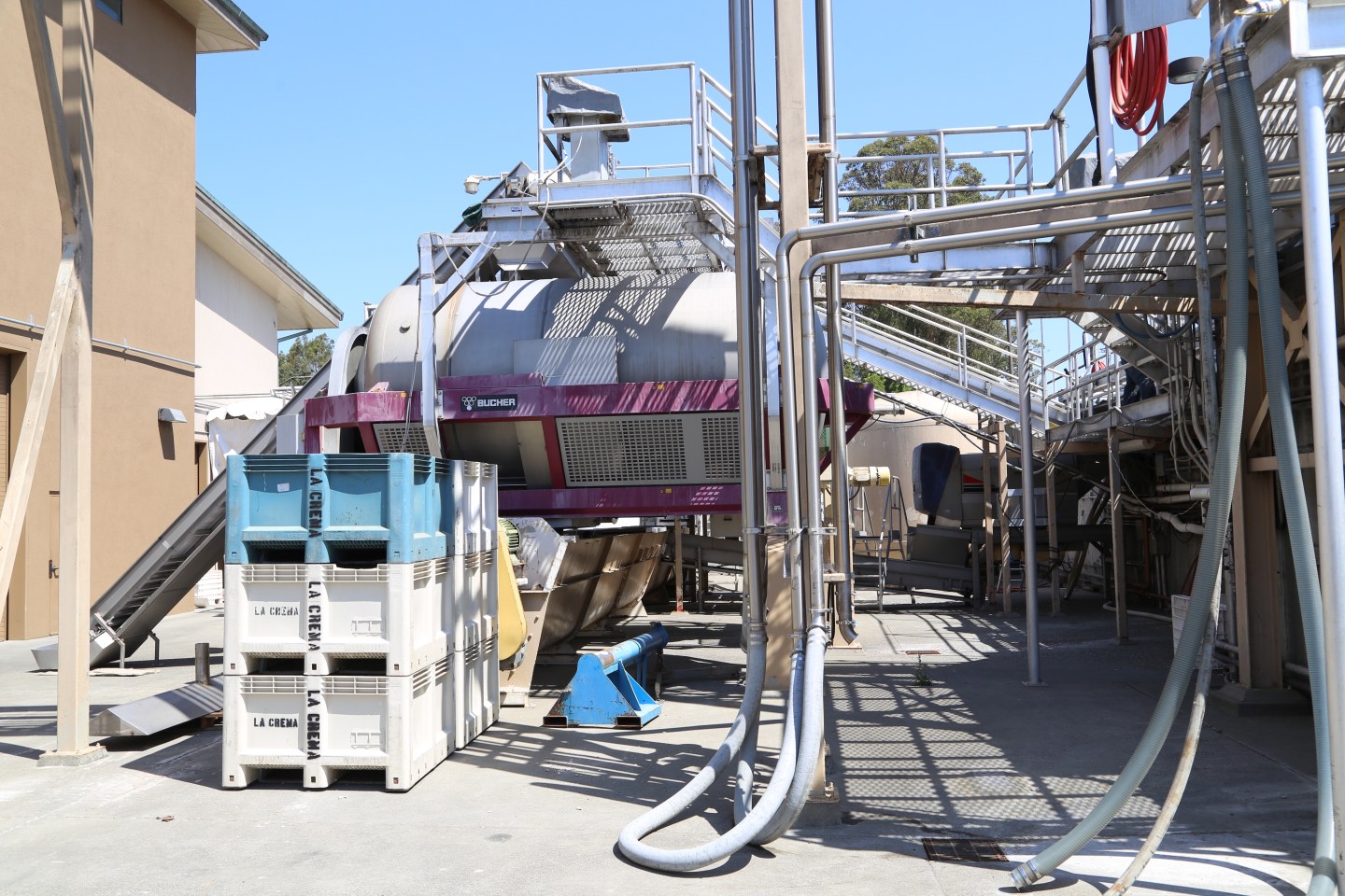 Outside of the cellar, and to the right of the Tesla batteries, there’s an ultra efficient natural gas water heater. Next to that the company plans to install a forward osmosis water treatment system which cleans water by pushing it through membranes under high pressure. A hundred feet away there’s a wine bladder press that discharges the leftover grape goop from wine making, which is fed to cows in the area.