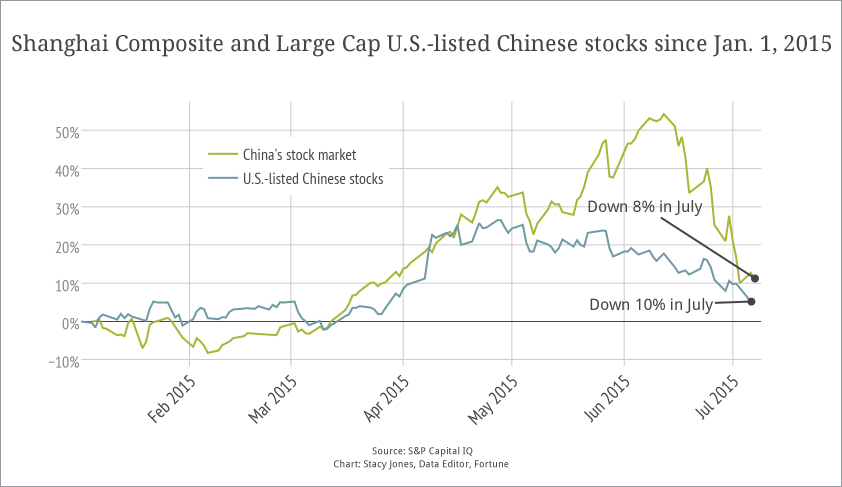But in the past week, there have been signs that what’s going on in the Chinese markets is not just about the markets, but potentially about China’s economy overall. U.S.-listed Chinese stocks are all of sudden doing worse than Chinese stocks listed on the local Shanghai exchange. Since the beginning of July, the iShares Large-Cap ETF, which is made up of large U.S.-listed Chinese companies including Alibaba (BABA) and others, is down about 10%. Alibaba recently fell to its lowest price since its IPO. The worst performer in the index is 500.com (WBAI), which offers online lottery services to Chinese provinces. That company’s stock is down 40% since mid-June.