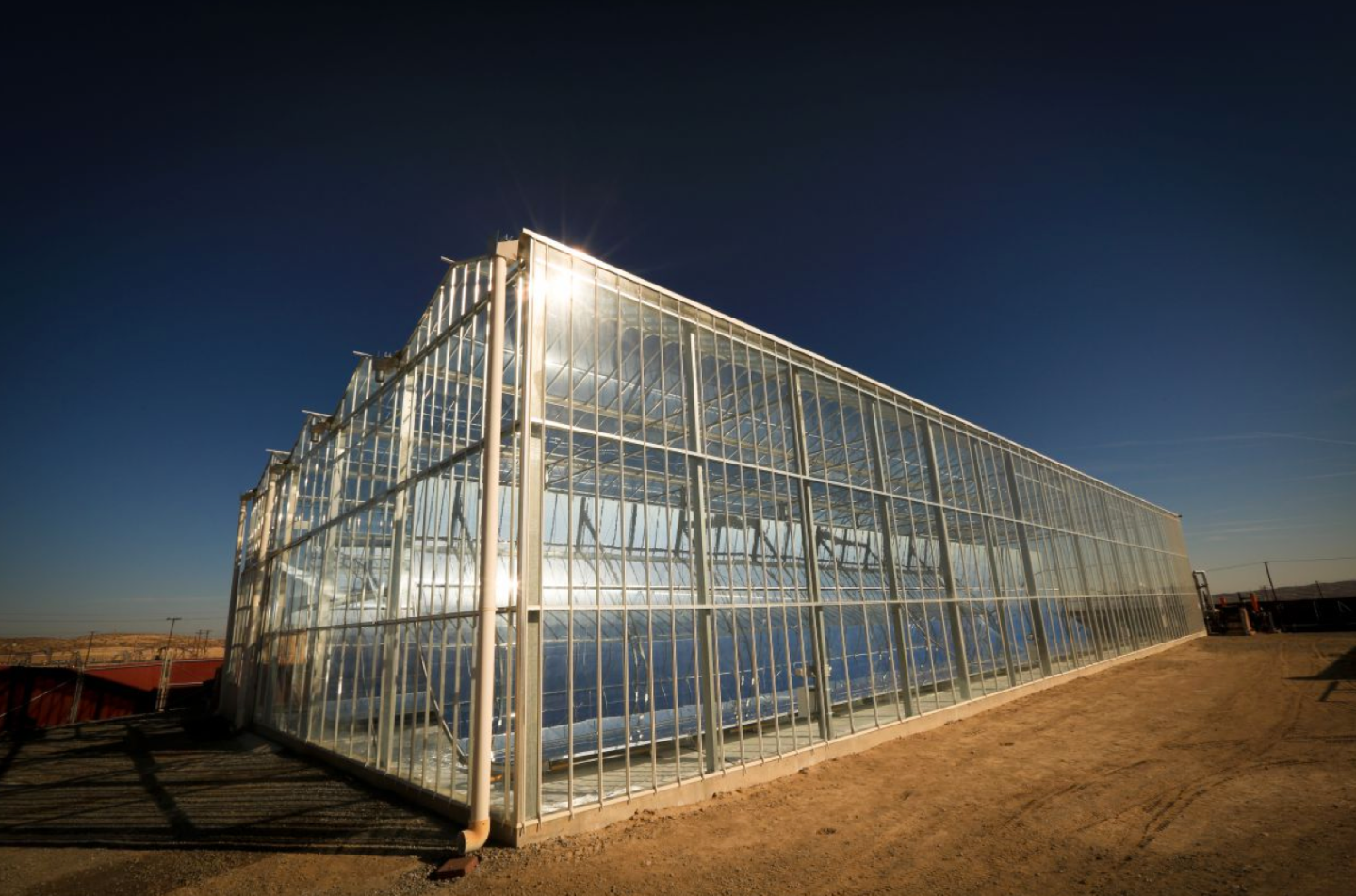 GlassPoint designs its solar farms using rows of glass houses containing six-meter high steel curved mirrors. The mirrors concentrate sunlight onto water-containing steel pipes that produce steam. The glass structures protect the equipment from wind, sand, dust and humidity.