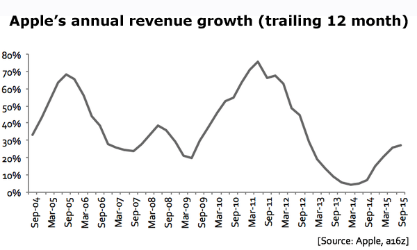 What Evans offers his 82,000 followers is the attached roller-coaster chart of Apple’s 12-month trailing revenue growth from September 2004 to July 2015.