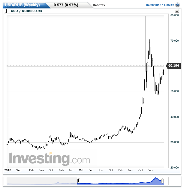 After having steadied at the start of 2015, the ruble is now falling again under fresh pressure from oil prices. On Tuesday, the dollar went through 60 rubles for the first time since March.