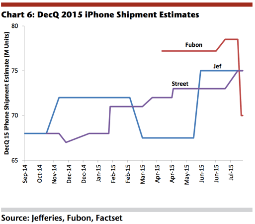 For the record, Fubon’s estimates for iPhone sales in the September and December quarters are outliers, well below the Street’s. And thanks to charts posted below, we know that the bank’s iPhone estimates in the past have been all over the lot: Too low in March, too high in June.