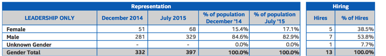 According to the report, the number of women in leadership roles increased from 51 to 68 since December 2014. Included in the “leadership” category are all employees at or above the level of VP, as well as Fellows and Senior Fellows (who represent top technical talent at the company, though not necessarily managerial leadership).