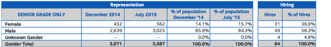 “[Intel] deserves a lot of credit, but there’s still a long way to go,” says Lucy Sanders, the CEO and cofounder of the National Center for Women & Information Technology (NCWIT), a nonprofit focused on increasing female participation in tech fields. As of July 2015, 17.1% of Intel’s leadership was female. While that’s an improvement on the company’s December leadership stats—15.4% female—it continues to show a vast gender gap at the top of the company. At the senior level, the proportion of female employees is even lower: just 15.7%, up from 14.1% at the end of 2014.