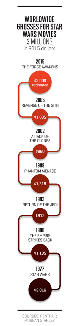 The wager seems to be well placed. “This has to rank as the most anticipated film in the last 20 years, easily,” says Paul Dergarabedian, a senior analyst with box-office research firm Rentrak (RENT). Other industry watchers, meanwhile, have been raising their ticket sales estimates. Morgan Stanley’s (MS) Benjamin Swinburne wrote in a recent report that he expects the film to be “wildly profitable,” trailing only 2009’s Avatar and 1997’s Titanic. The new Star Wars episode could bring in $650 million in the U.S. alone and $2 billion globally, he predicts—figures within shouting distance of those of most other analysts. That doesn’t count the additional $5 billion in merchandise sales (for branded toys, videogames, and other paraphernalia) expected in 2016 alone, nor does it begin to take into account the multi-year-long pipeline of other Star Wars movies, TV shows, and themed amusement park “experiences” now in the works. In other words, Kennedy has enough projects to keep her busy for years to come—and, quite likely, to make the new Lucasfilm head, who reports to Disney Studios chairman Alan Horn but also directly updates Iger (and the board), an indispensable asset to the parent company.