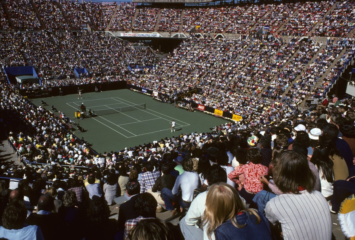 Night tennis makes its debut at the 1975 US Open—the first of three U.S. Opens played on clay courts. The lights at the West Side Tennis Club shine on one of the greatest comebacks in tennis history as Manuel Orantes upsets top-seeded and defending champion Jimmy Connors, in the men's singles final. Taken on September 8, 1975.