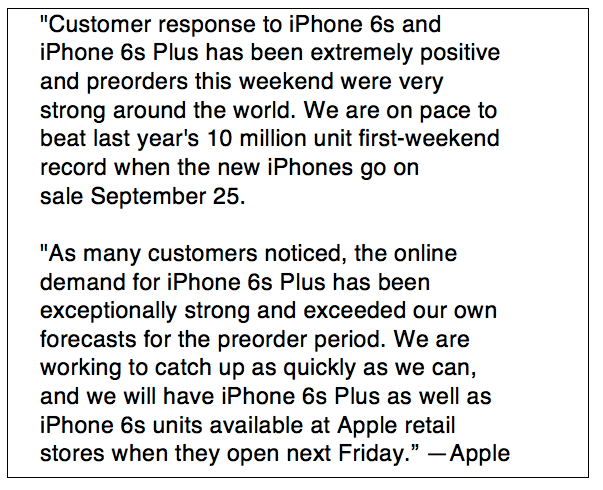 Daniel Ives, FBR: iPhone 6s Pre-orders Off to a Strong Start Led by China. “This weekend Apple kicked off pre-orders for its freshly launched iPhone 6s/6s Plus with retail stores set to sell on September 25. Initial demand looks strong based on estimated wait times as displayed on Apple’s Web site and various blogs. Most importantly in our view, the wait time of iPhone 6s Plus in China is already running three to four weeks, and two to three weeks for the 6s. The U.S. and U.K. also looked strong on initial pre-order data, showing wait times of roughly three to four weeks for 6s Plus with shorter wait times for 6s depending on model/carrier. While there are still unknowns about inventory levels, we note that China demand in particular looks “very strong” out of the gates and is a positive sign that the white-hot momentum out of this region shows no signs of abating despite macro headwinds out of China.” Outperform. $175.