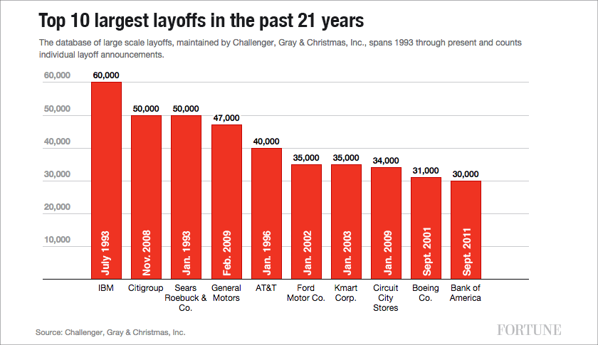 But despite its size, HP’s layoffs are not the largest of the lot in the recent past. According to outplacement firm Challenger, Gray & Christmas, the following companies can claim that ominous distinction.