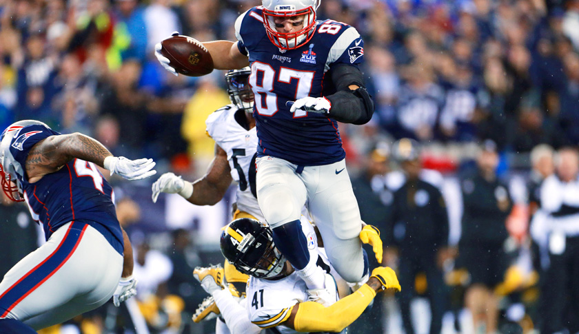 “Two hundred thousand sign-ups today,” he says with genuine disbelief. That’s 10 times what DraftKings has ever seen in a day and it’s just the latest addition to a user base that totals more than 4.5 million people. On the field, Patriots tight end Rob Gronkowski bats away two defenders. “There’s too much happening,” Robins says without looking up.