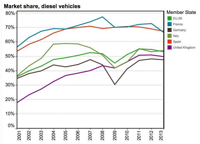Diesel vehicles account for around half of the new car market, where Volkswagen–with its stable of brands including Skoda, Seat and Audi–is market leader with a share of over 20%.