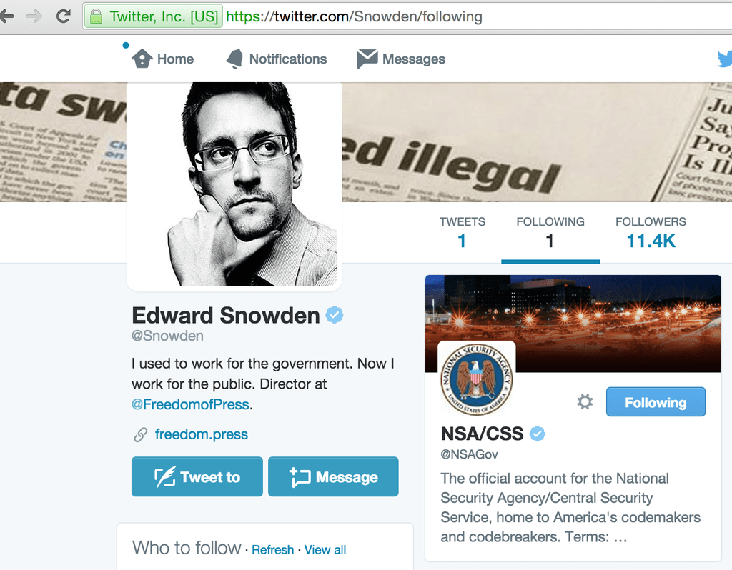 In a preemptive move, Snowden followed the NSA’s official account “@NSAGov” shortly after joining. (See photo above.) As of the writing of this post, the NSA has not—at least officially—returned the follow.