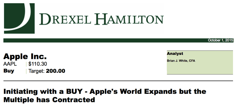 “We are initiating coverage of Apple with a BUY rating and a 12-month price target of $200.”