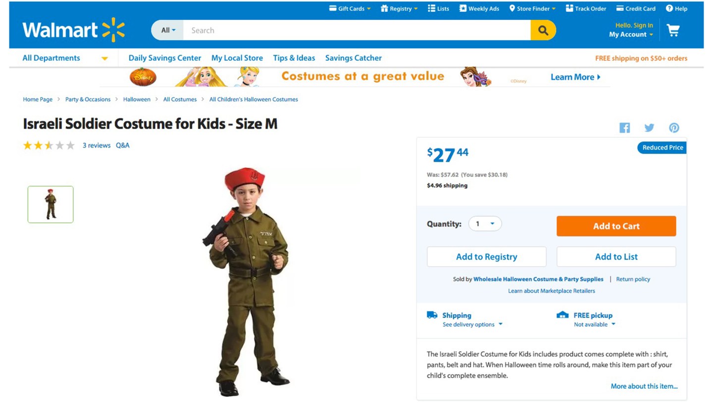 The costume is called “Israeli Soldier Costume for Kids,” and it is currently available on Walmart’s website. The costume is essentially a miniature version of the standard Israeli Defense Forces uniform, complete with green fatigues and a red beret. The Israeli-Palestinian conflict, always a hot-button issue, has been particularly volatile in recent weeks. Palestinian citizens have launched terror attacks against Israeli citizens with knives, leading some to call the wave of violence a “knife intifada,” a reference to two previous instances of Palestinian uprisings.
