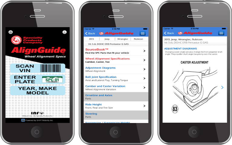 Specialty Products Company, which designs and makes suspension parts and tools, is one of the first private labels as a service client. The company used the branded app service to build a mobile app called AlignGuide. Dealers and repair centers can use AlignGuide to scan a vehicle’s VIN, enter the license plate ID, or pull down the year, make, and model to diagnose and correct an alignment problem and many suspension issues. Users can also see illustrations of alignment adjustment methods and service parts to install. AlignGuide is available at the Google and Apple stores.