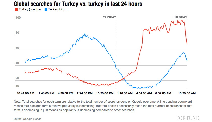 The interest was short-lived, however. At about 11:15 a.m., searches for both Turkey and turkey began to decline, and the downward slope will likely continue over the next 24 hours.