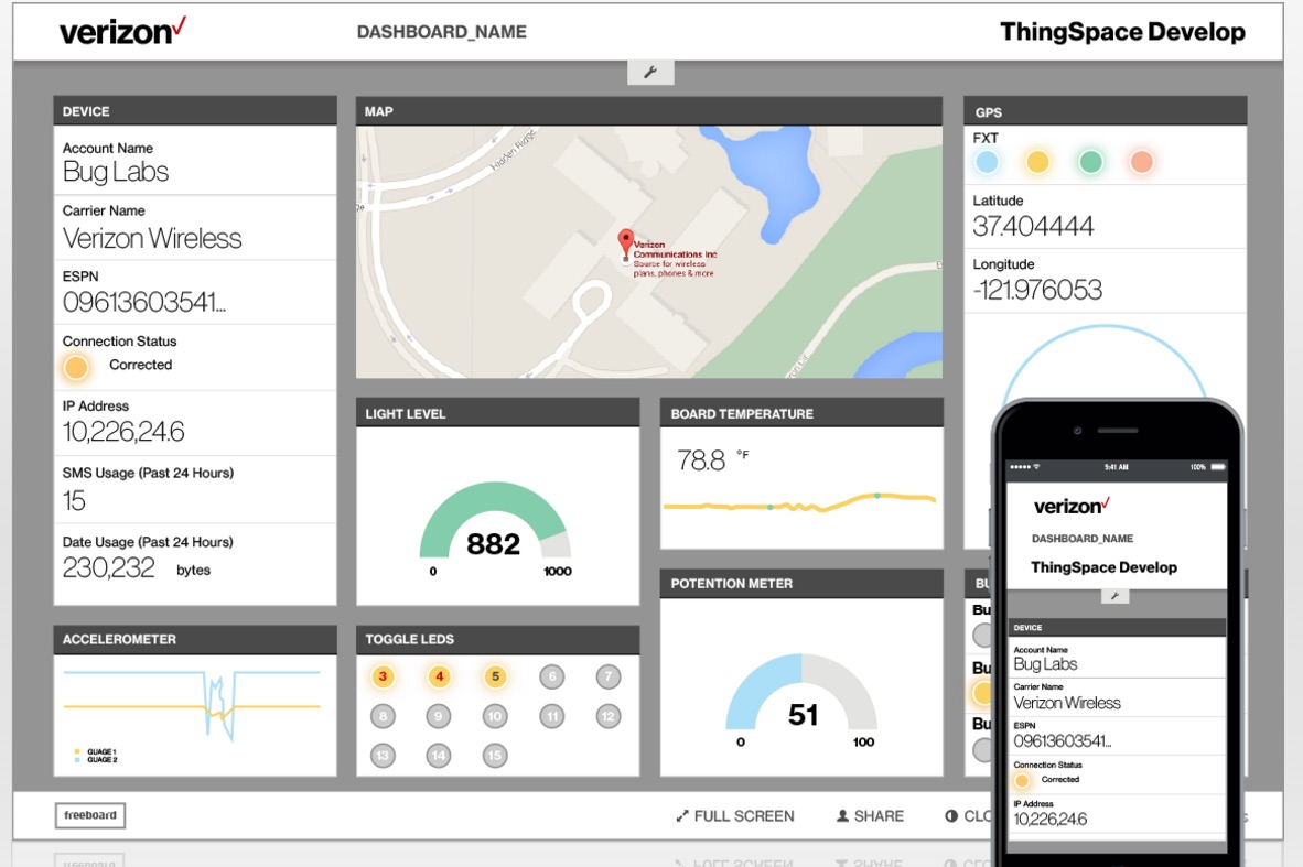 One of those ways is the new ThingSpace cloud which also opened to developers today. The cloud offers tools from a startup called BugLabs. This should be an improvement over Verizon’s own efforts at building tools, another lesson Lanman had said Verizon learned from the mobile OS battles Verizon tried to fight in the early aughts. BugLabs counts customers such as Ford, Renesas, and now Verizon as customers. Its APIs let customers bring in sensor data easily and then turn that data into easy-to-understand charts, and then into software that will notify people if temperatures go to high or other parameters are breached.