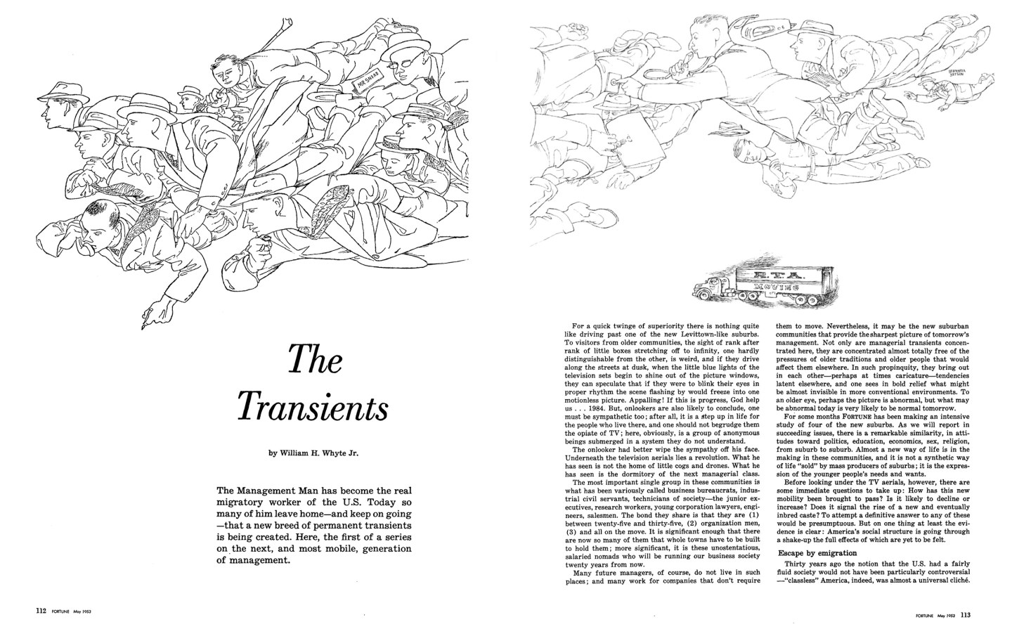 Editor’s note:The following article, written by noted sociologist William Whyte for the May 1953 issue of Fortune, focuses on the rise of “the organization man,” a term Whyte coined to describe a burgeoning cohort of middle class business managers who left their hometowns to launch careers; the development of corporate culture; and the suburbs that were built to accommodate these workers’ lifestyles. In 1956, Whyte published a highly influential book on the topic, called “The Organization Man.”