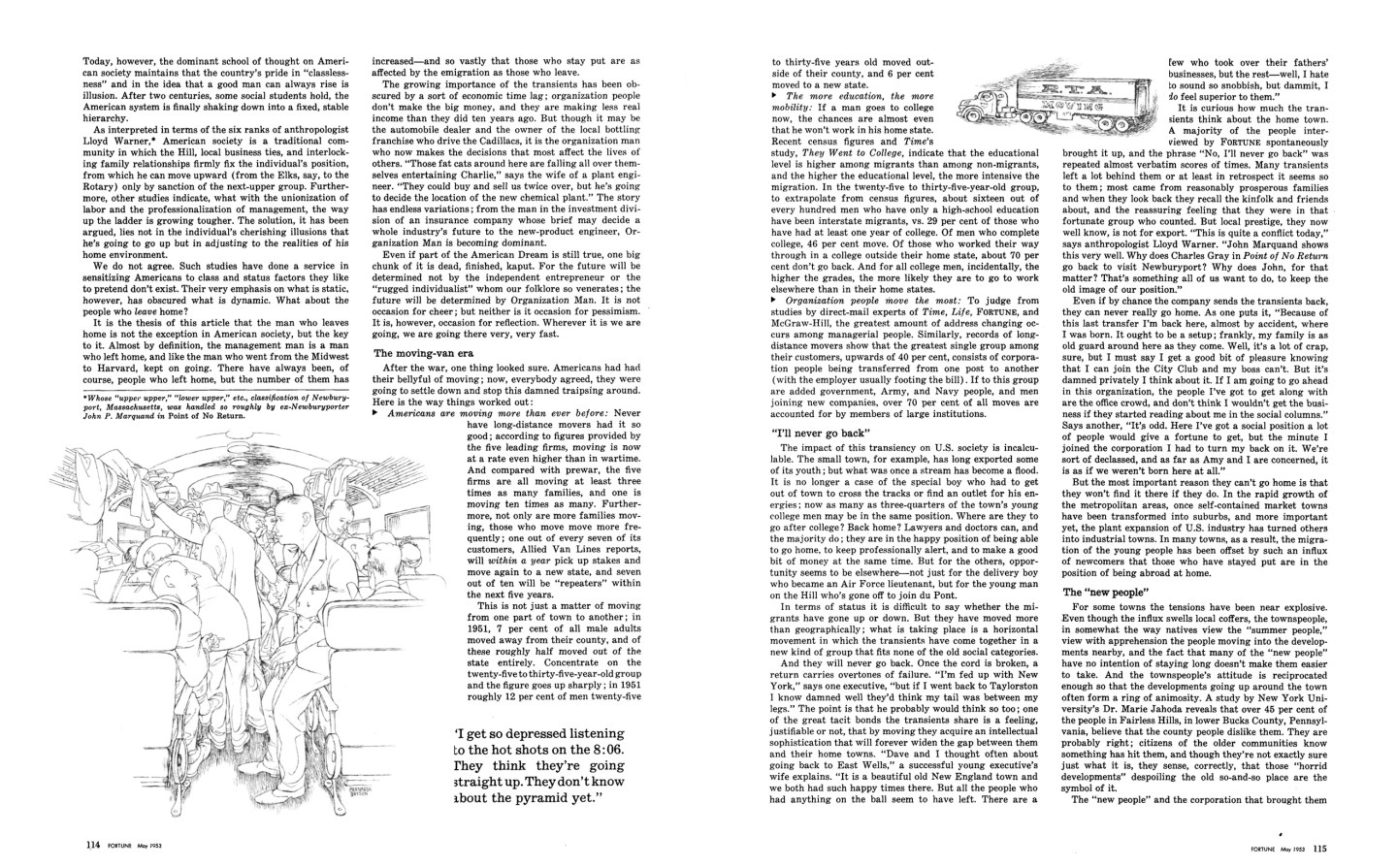 In the wake of this shift to the big organization is the moving van. Certainly the recruit does not join up because he wants to move a lot, and it is often in spite of it. But moving, he knows, has become part of the bargain, and unsettling as transfer might be, even more unsettling are the implications of not being asked to transfer. “We never plan to transfer,” as one company president explains, a bit dryly, “and we never make a man move. Of course, he kills his career if he doesn’t. But we never make him do it.” The fact is well understood; it is with a smile that the recruit moves—and keeps on moving, year after year; until, perhaps, that distant day when he is summoned back to Rome.
