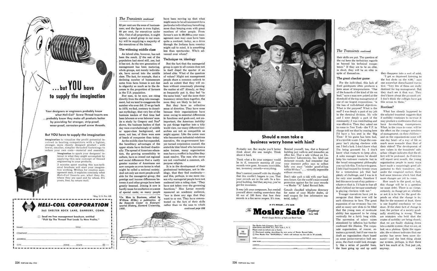 What has already happened to the salaried transient suggests that if mobility continues to increase it may produce a rootlessness that can have far-reaching consequences. What, in the years to come, will be the effect on the younger members of management, on their children—and on the organizations some will one day head—of a way of life so much more nomadic than that of their elders? The development of new values in the transients’ suburban villages indicates that the effect will be profound. As Fortune will report next mouth, the young organization people in many ways have made a surprisingly good adjustment to their transiency, yet, under the congenial surface, there boil some tensions which hint that more changes are yet to come.