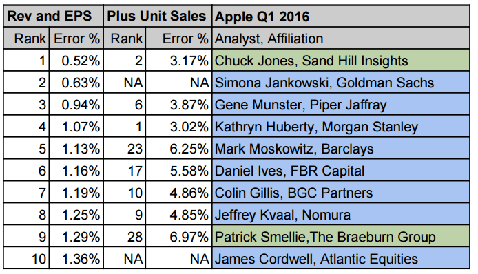 Simona Jankowski, a newcomer from Goldman Sachs, who nailed Apple’s EPS to the penny on her first time out. (She’s NA in the other ranking because she didn’t submit Mac or iPad numbers.)