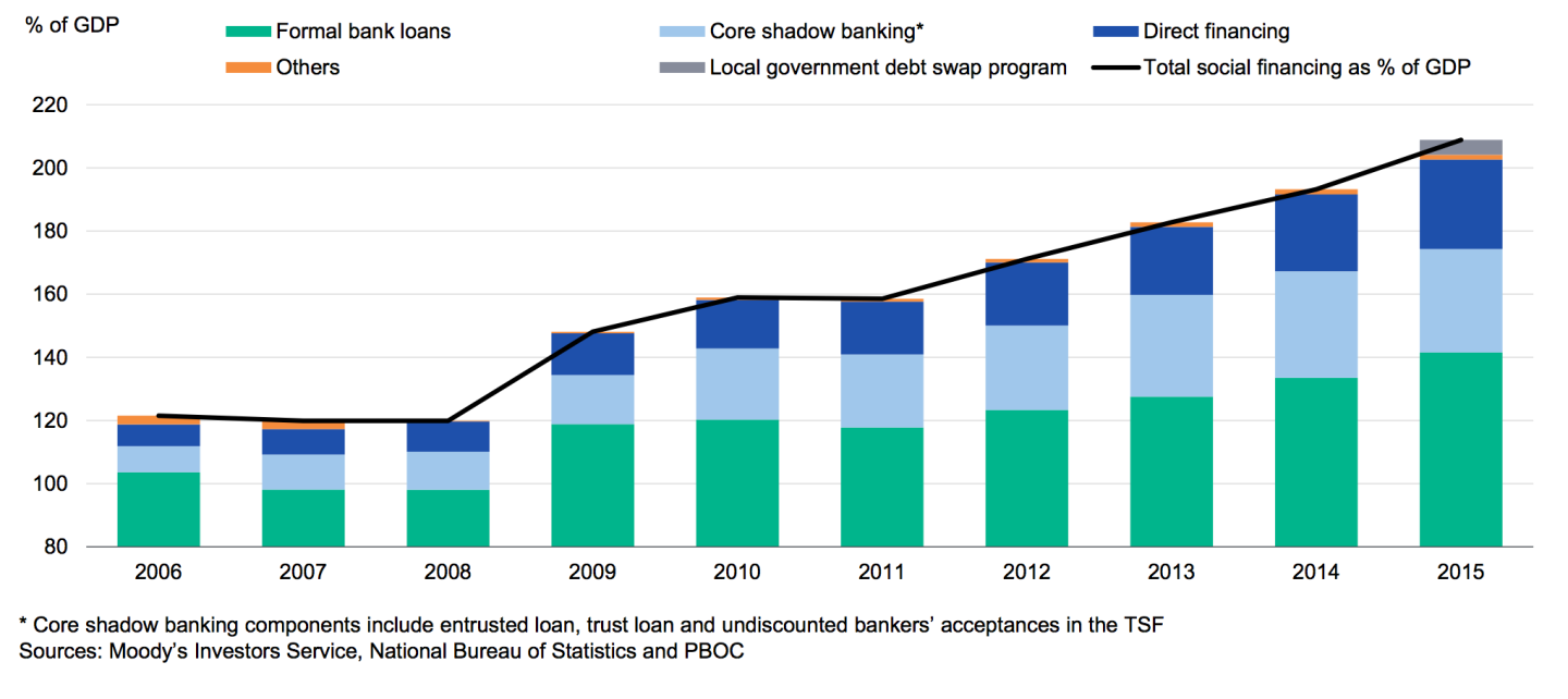 “Overall credit growth (described officially as Total Social Financing) continues to grow faster than nominal GDP, and has even accelerated, leading to rising leverage,” Moody’s says. TSF is a metric invented by Beijing that captures lending to non-state entities like private companies and people, but excludes central and local government borrowing.