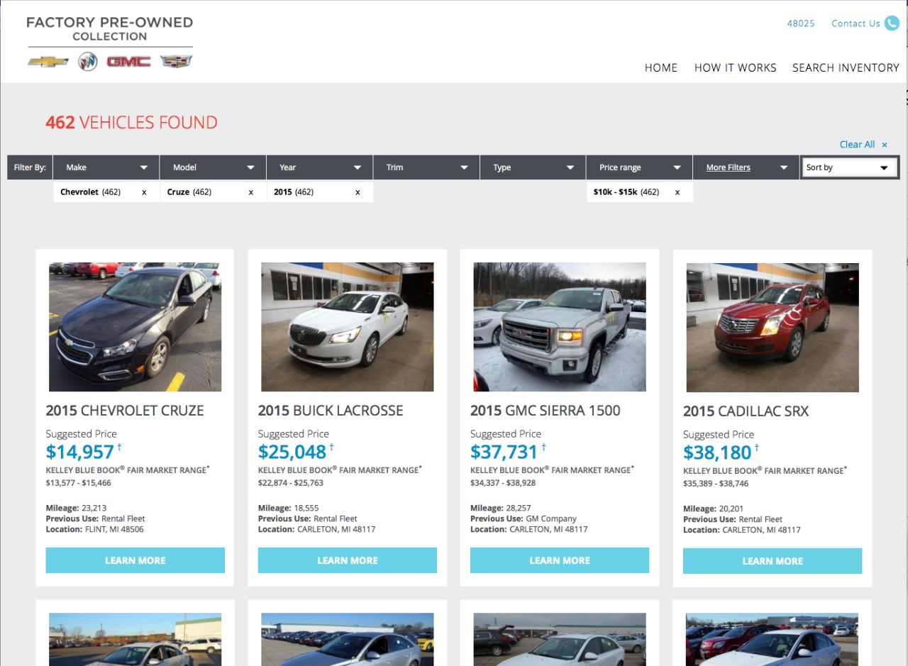 General Motors has premiered an online cars sales website that lets consumers shop and buy factory-owned used Chevrolets, GMCs, and Cadillacs. The site, which went live Tuesday, is an expansion of Shop-Click-Drive, an online sales program for new cars that helped participating dealers sell nearly 40,000 vehicles in 2015.