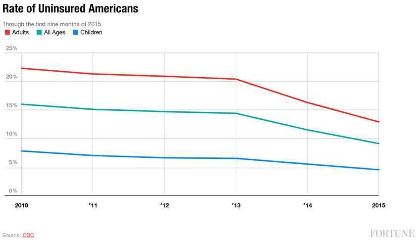 The number of people with health insurance are at their highest levels in nearly 20 years. In the first nine months of 2015, nearly 91% of people, from babies to 64-year-olds, had some form of health insurance. That’s 16 million more people than in 2013, before the Affordable Care Act went into effect.
