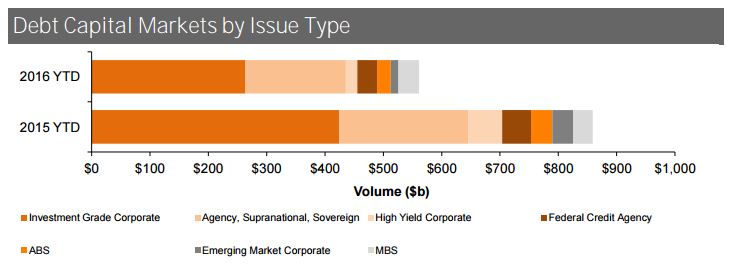 Thomson Reuters on Friday published data showing that the credit crunch isn’t limited to high yield. Instead, U.S. marketed investment grade debt issuance is down 19% compared to the same period in 2015, despite a massive $45.6 billion loan package to support Anheuser-Busch InBev’s (BUD) pending purchase of rival brewer SAB Miller. Moreover, the actual number of new issues is off 45% year-to-date, making it the slowest start to any calendar year since 1996.