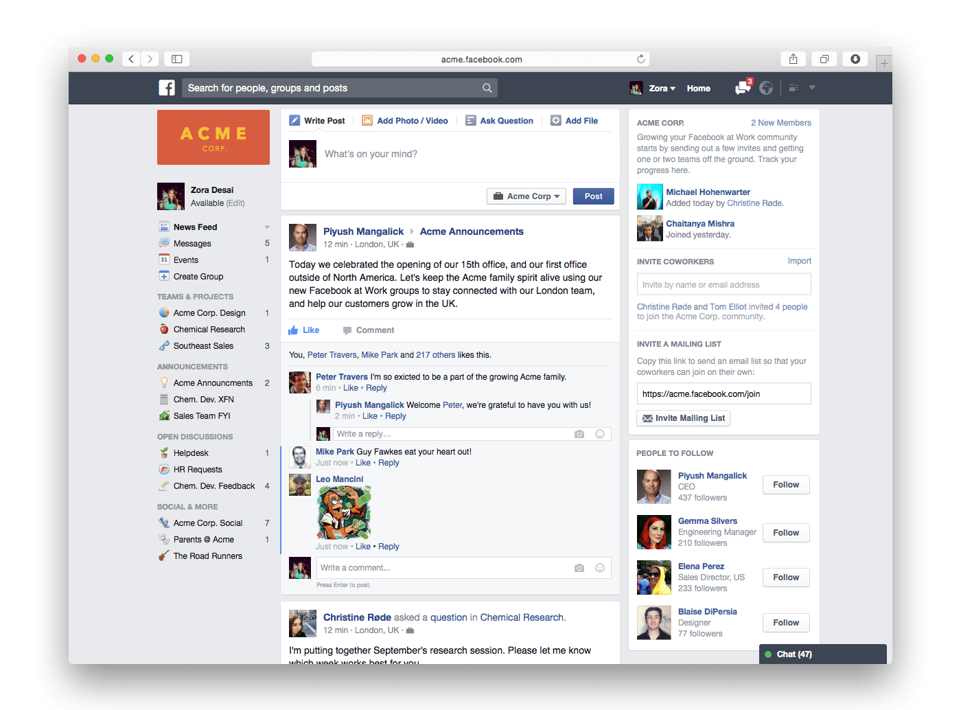 The idea is to apply ideas from the consumer edition of Facebook—like sharing status updates, posting articles in newsfeeds, and group chats—to the business world. Facebook’s “work” edition looks a lot like the consumer edition, but the focus of the information shared there will, generally speaking, focus less on personal revelations like baby photos and more on project updates, sales leads, and customer service problems.
