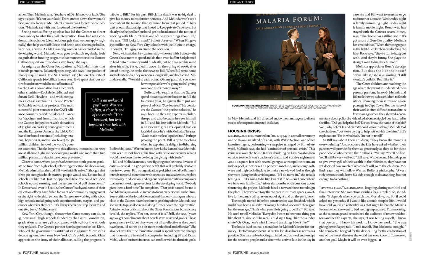 The impact comes from the combination of Melinda‘s holistic vision and Bill’s brainpower. Bono, the rock star-humanitarian who is both a friend of the Gateses and a grantee (through his One antipoverty campaign), calls their relationship “symbiotic.” Noting Bill’s fierceness, Bono says, “Sometimes I call him Kill Bill. Lots of people like him—and I include myself—are enraged, and we sweep ourselves into a fury at the wanton loss of lives. What we need is a much slower pulse to help us be rational. Melinda is that pulse.” Buffett also believes that Melinda makes Bill a better decision-maker. “He’s smart as hell, obviously,” Buffett says. “But in terms of seeing the whole picture, she’s smarter.” Would Buffett have given the Gates Foundation his fortune if Melindawere not in the picture? “That’s a great question,” he replies. “And the answer is, I’m not sure.”