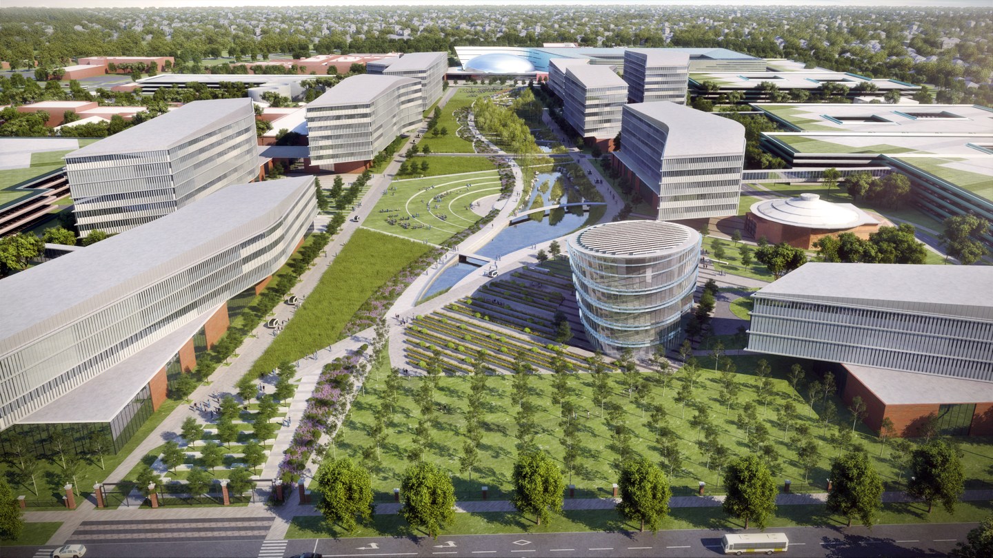 The campus will also feature a sustainability showcase, a large glass circular structure that Gaudette touts will be a net zero-energy and net zero-water facility using geothermal heating and cooling as well as solar panels. Geothermal heating will also be deployed throughout the campus. The sustainability building could even double as a welcome center.