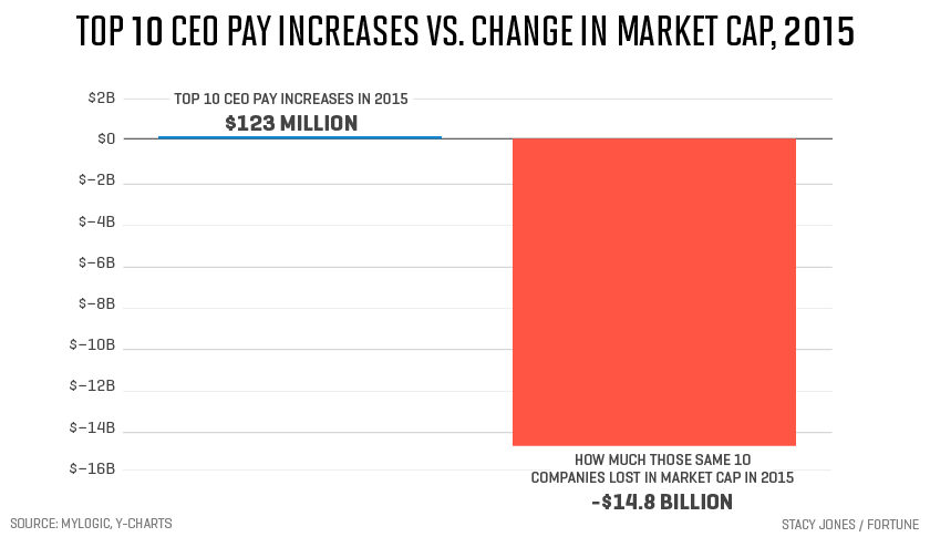 Pichai was far from the only big increase, though. At 80 of the 408 companies Fortune reviewed, CEOs received raises of more than 20% in 2015. Wages for all Americans, by contrast, climbed just over 3% last year. At the top ten companies that paid the highest raises to top executives with fiscal years ending in December, CEOs took home an additional $123 million in 2015 collectively. That was far better than the investors in those companies fared. The market caps of those same companies in 2015 shrank by a collective $14.8 billion.