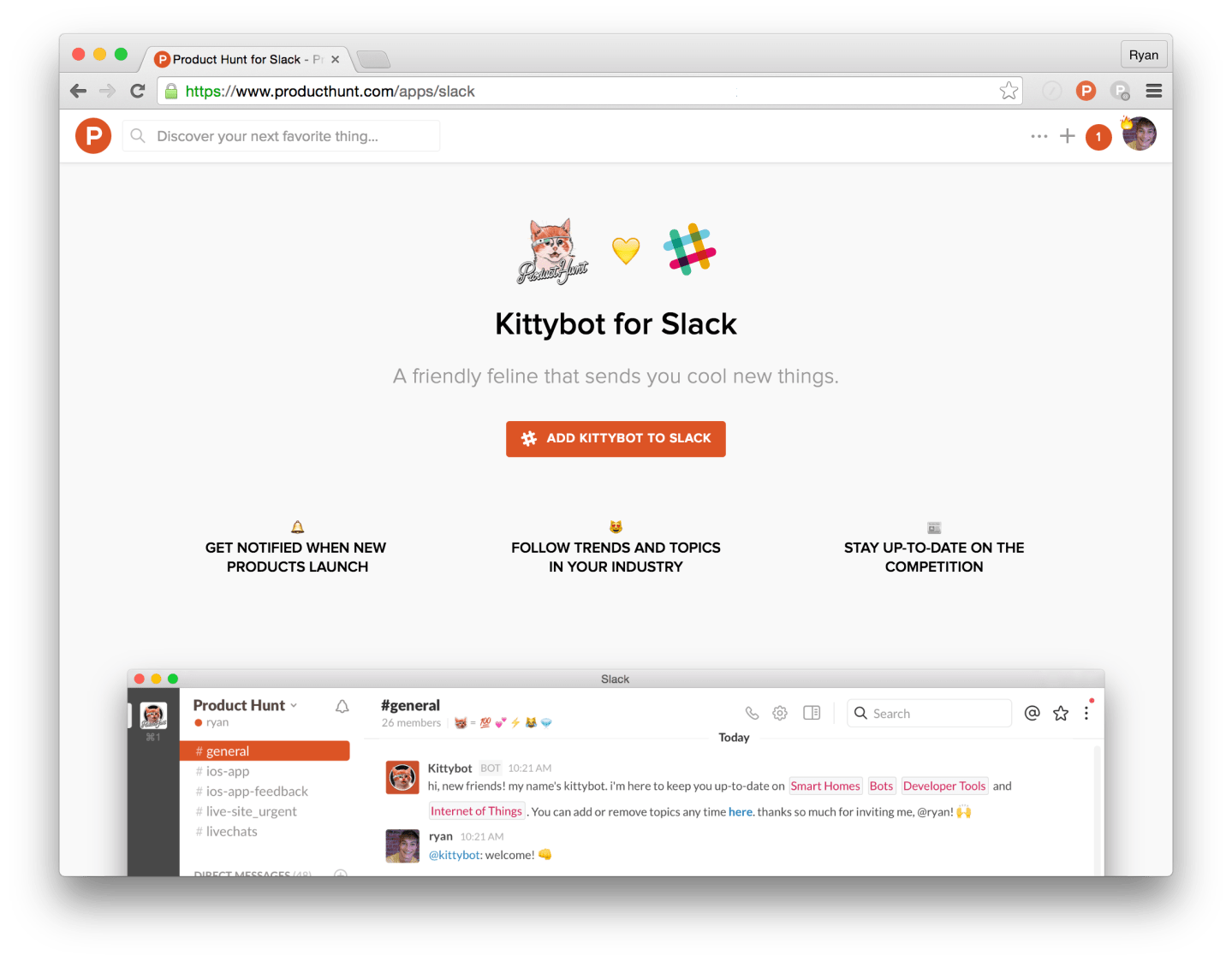 “A ton of people in the Product Hunt community use Slack every day (it’s one of the reasons why Slack is one of the most followed topics). We also surveyed our community and asked ‘Why do you use Product Hunt?'” founder and CEO Ryan Hoover told Fortune via email, adding that many users said it helps them stay current on new products as they work on their own startups and projects. “So we decided to focus on the business use case, giving people the opportunity to get notified when new things launch in topics they care about.”