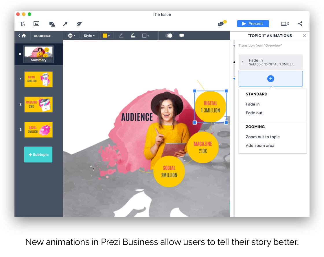 Prezi’s pitch has been that audiences respond better to presentations that rely more on visual cues than on mind-numbing lists. Its service departs from the traditional slide show template that most widely used presentation apps focus on. Instead, people organize their ideas visually on a “canvas” using photos, graphics or key phrases. The presenter can drill down or “zoom” into these subjects based on what a particular audience requires, rather than being forced to stick to a linear presentation style.