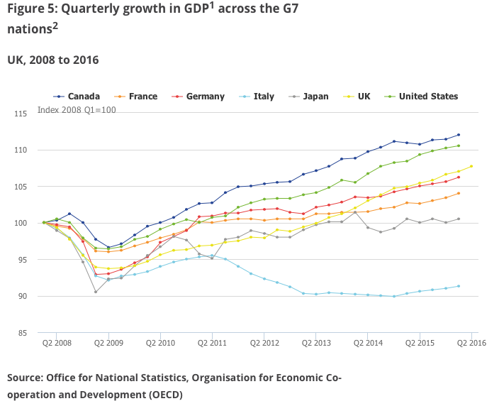 The official data follow hard on the heels of last week’s labor report, which showed joblessness at an eight-year low and the highest-ever employment rate in the U.K. in 45 years of measuring the labor force. Those figures appear to clash with the narrative that the vote to leave the European Union on June 23rd came from a population despairing at being “left behind” by the forces of globalization. The U.K. has actually grown more than any of the other three European G7 members since the financial crisis struck in 2008.
