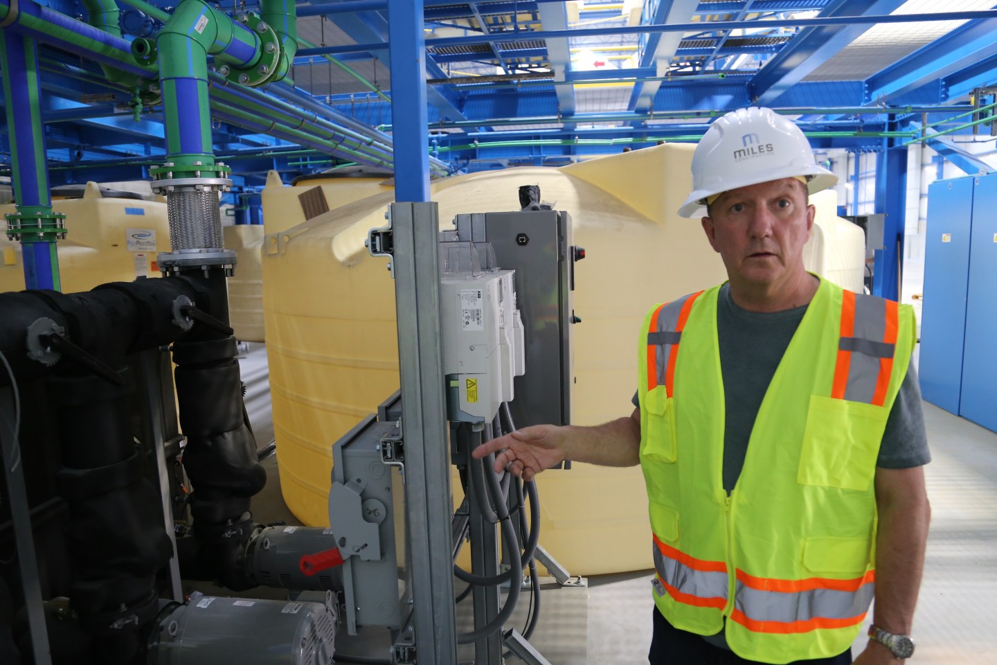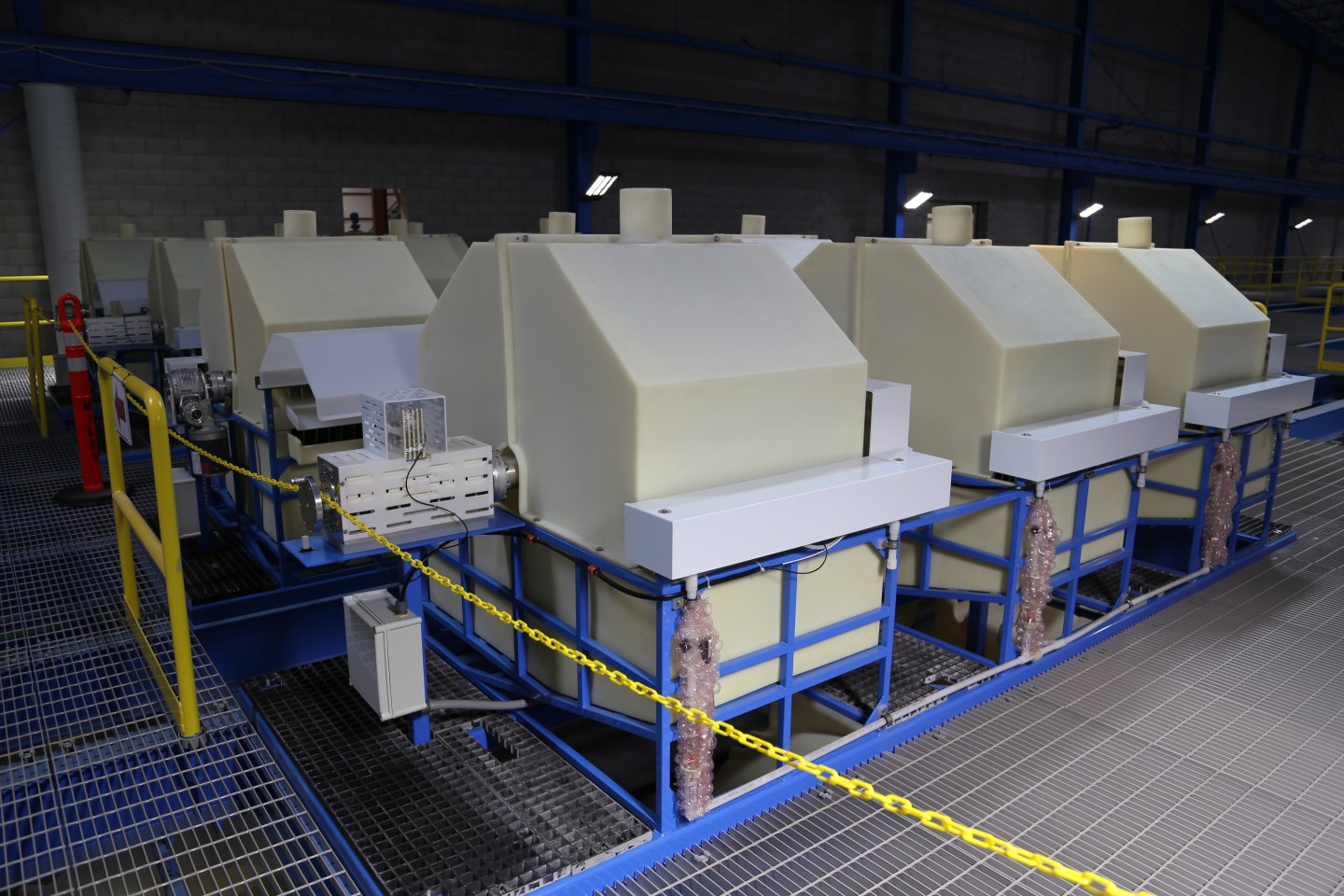 The company takes the lead paste and puts it into tanks that remove the sulfur from it. Then the lead solution goes into a digestor and gets dissolved into an electrolyte. Next it goes through an electrolyzer, which uses electricity to produce a chemical reaction. Spinning discs scrape off the lead paste from the electrolyzers onto another conveyor belt.
