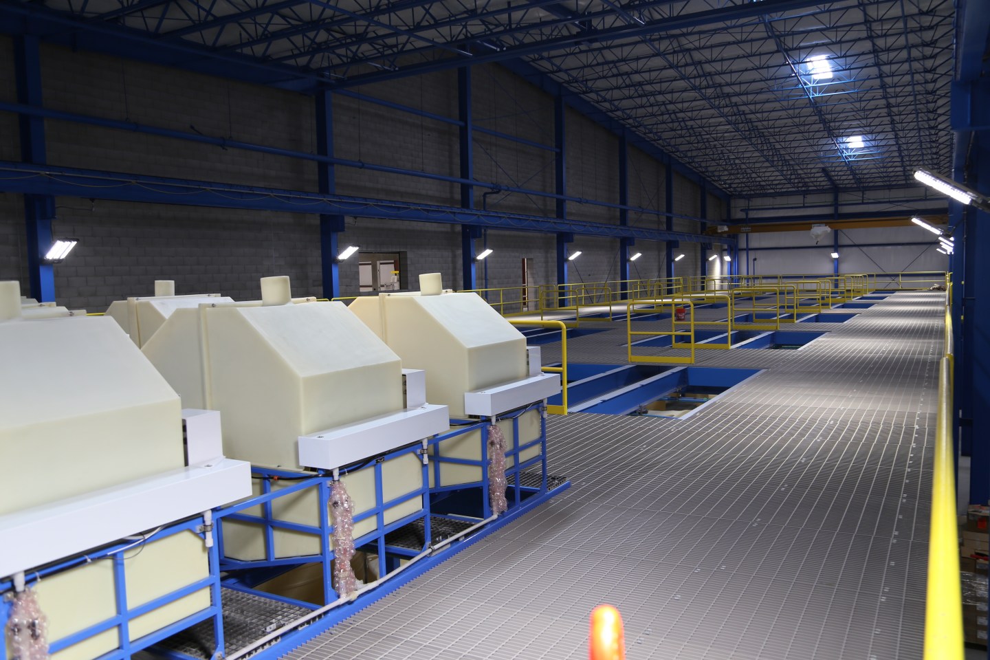 After the batteries arrive at the factory, they’re put on a conveyor belt, which takes them into a machine that basically tears them apart, pulling out and collecting the liquid sulfuric acid in tanks, and the plastic casing, which will be made into pellets and recycled.