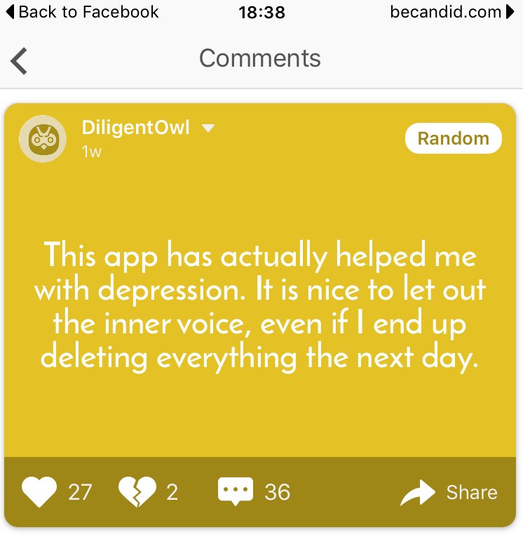 “If you don’t have identity associated, then you can have much more frank discussions,” says Reddy. “So if I say I’m going to get divorced, on Facebook that might seem really awkward and no one would respond, because everyone’s politically correct. But on Candid, I would get dozens of people responding.”