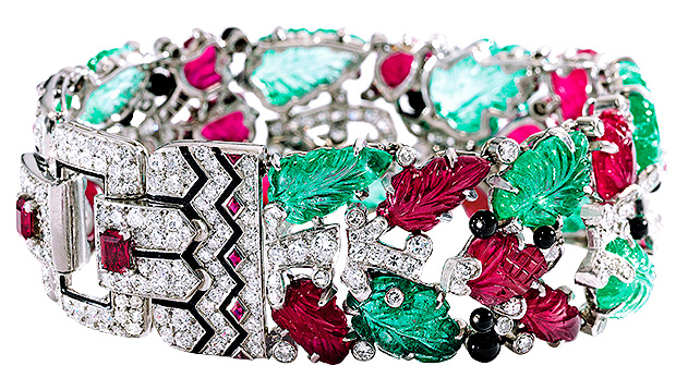 Singular among them are Cartier’s signature “Tutti Frutti” jewels. Created in an opulent style that first became popular in the 1920s, the pieces combine Indian carving techniques and French platinum and diamond mountings. In 2014, Sotheby’s set a world record, selling a Tutti Frutti bracelet owned by the late Evelyn Lauder for $2.1 million.