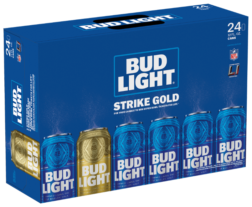 The brewing company behind Bud Light, the official beer sponsor of the NFL, announced its Super Bowl contest last week involving gold cans of beer. Similar to how the golden tickets gave chocolate eaters a chance to go to Willy Wonka’s chocolate factory, the golden beer cans give drinkers a chance to win a lifetime supply of Super Bowl tickets. You can find the specialty beer in 18-, 24-, and 30-packs of Bud Light marked “Strike Gold,” according to the press release.
